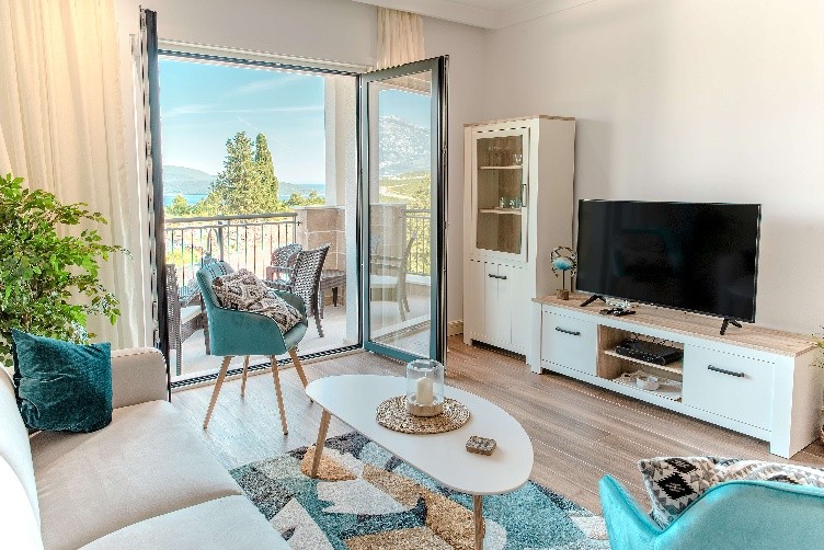 - T1 – до 2 взрослых и 2 детей до 12 лет, общая площадь 44 кв.м, спальня с двумя кроватями; гостиная с диваном-кроватью и кухней, ванная комната, балкон, откуда виден морской горизонт.